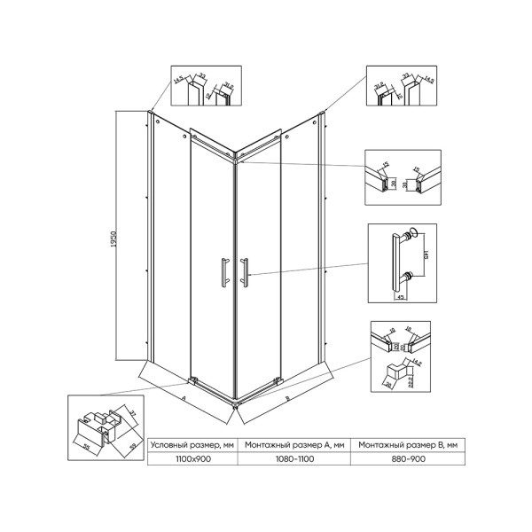 Душ угол раздвижной 1100х900х1950 стекло прозр 6мм профиль хром VECONI